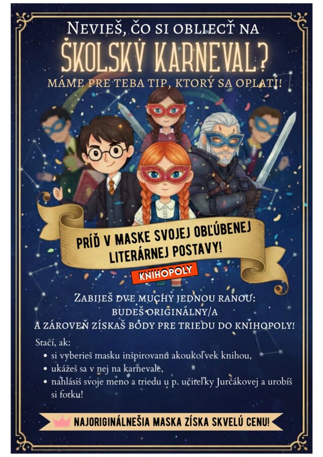 Tip pre triedy, ktoré súťažia v Knihopoly: Príďte na karneval v maske literárnej postavy a získajte extra body do súťaže! Stačí sa v kostýme odfotiť u p. uč. Jurčákovej a nahlásiť svoje meno s triedou. Najoriginálnejšia maska navyše získa skvelú cenu, tak neváhajte a ukážte svoju kreativitu!