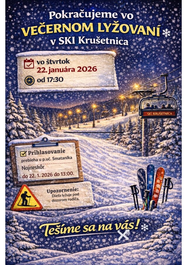 Pokračujeme vo večernom lyžovaní v SKI Krušetnica, ktoré sa uskutoční: